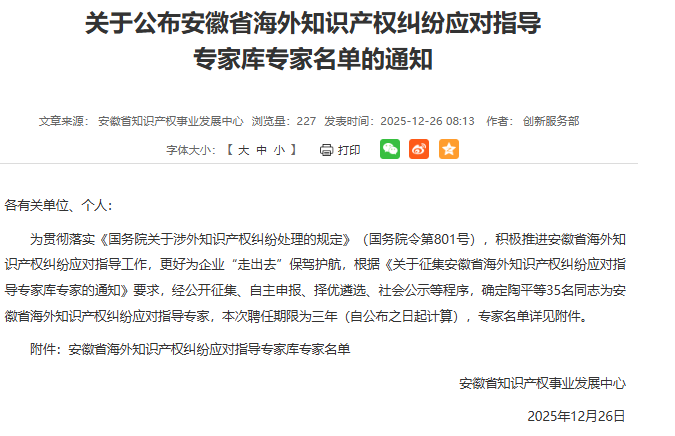 为贯彻落实《国务院关于涉外知识产权纠纷处理的规定》(国务院令第801号),积极推进安徽省海外知识产权纠纷应对指导工作,更好为企业走