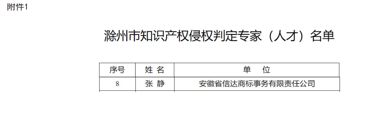 为深入实施知识产权强市战略,充分发挥知识产权人才在滁州市知识产权创造、运用、保护、管理、服务工作中的支撑作用,滁州市市场监督管理局(知识产权局)于近日组织开展了知识产权专家(人才)库专家、人才征集工作。经个人申报、单位推荐、资格审核等程序,安徽省信达商标事务有限责任公司(以下简称信达商标)副总经理张静被聘任为“滁州市知识产权侵权判定专家”。