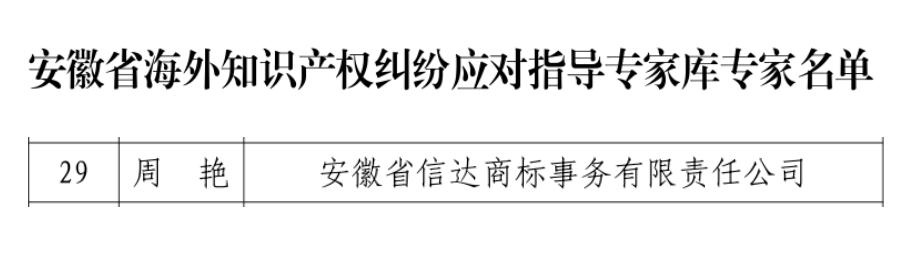 为贯彻落实《国务院关于涉外知识产权纠纷处理的规定》(国务院令第801号),积极推进安徽省海外知识产权纠纷应对指导工作,更好为企业“走出去”保驾护航,安徽省知识产权事业发展中心(以下简称中心)经公开征集、自主申报、择优遴选、社会公示等程序,确定35名同志为安徽省海外知识产权纠纷应对指导专家,安徽省信达商标事务有限责任公司副总经理周艳成功入选。